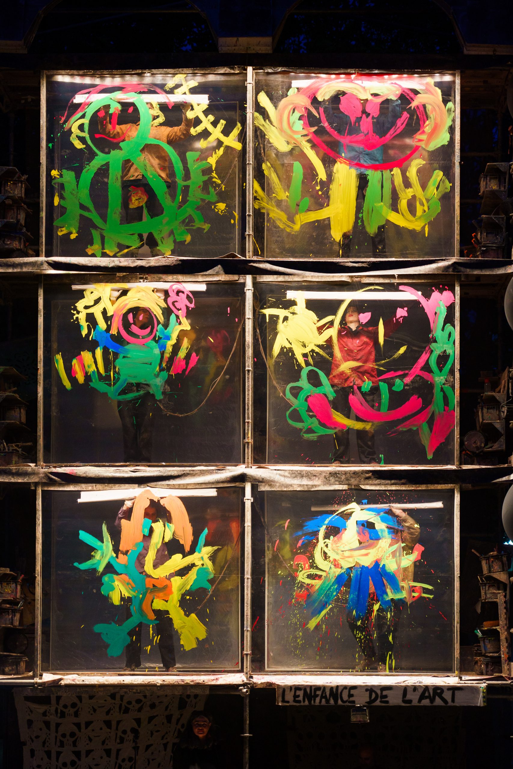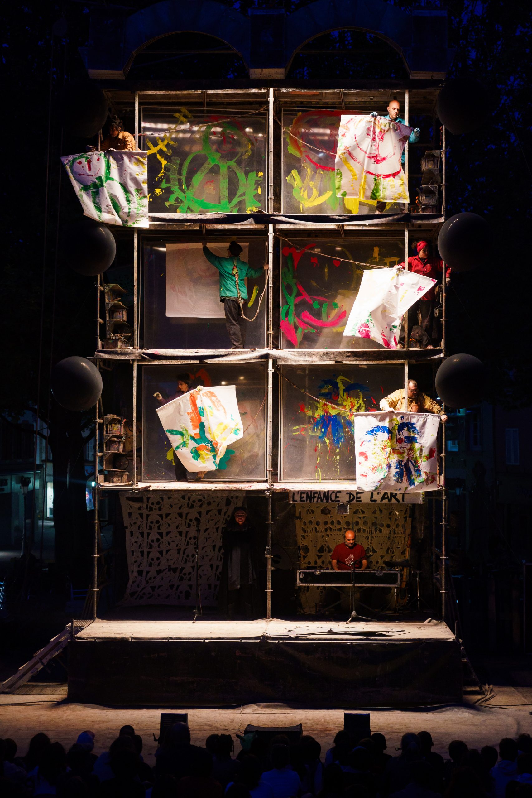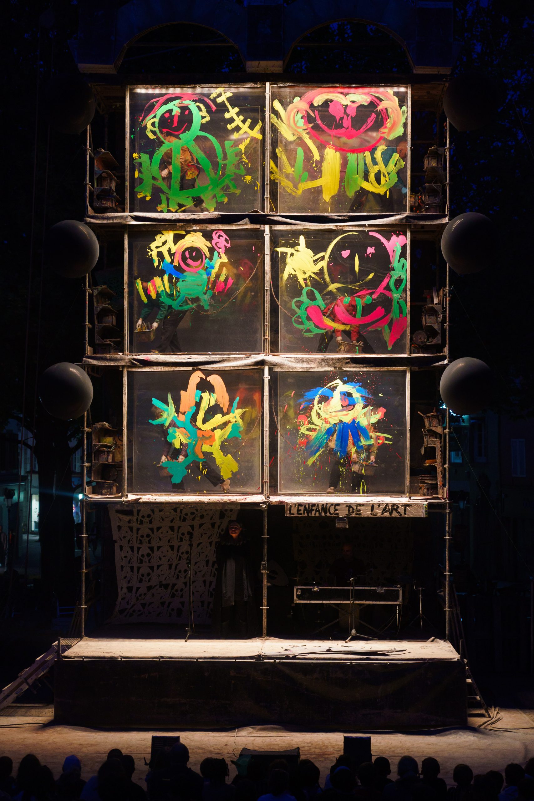 Un musicien et une récitante occupent le premier niveau d’une impressionnante structure métallique de 9 mètres de haut. Aux étages supérieurs, six peintres s’activent derrière des toiles transparentes. Chacune des toiles ne représente qu’une partie de la grande image offerte. C’est sans jamais rien voir du travail de ses pairs que chaque peintre contribue à l’oeuvre collective. Ce ballet est un bouillonnement de sons et de couleurs. Nous devenons des enfants pris dans l’émerveillement des images mobiles d’une lanterne magique. Luc Amoros dessine à grands coups d’ombres, de pinceaux ou de caméras un théâtre d’illusions fabriquées en direct…
