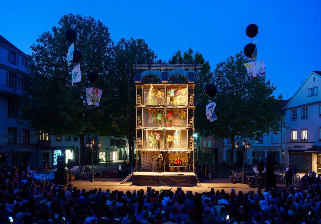Un musicien et une récitante occupent le premier niveau d’une impressionnante structure métallique de 9 mètres de haut. Aux étages supérieurs, six peintres s’activent derrière des toiles transparentes. Chacune des toiles ne représente qu’une partie de la grande image offerte. C’est sans jamais rien voir du travail de ses pairs que chaque peintre contribue à l’oeuvre collective. Ce ballet est un bouillonnement de sons et de couleurs. Nous devenons des enfants pris dans l’émerveillement des images mobiles d’une lanterne magique. Luc Amoros dessine à grands coups d’ombres, de pinceaux ou de caméras un théâtre d’illusions fabriquées en direct…
